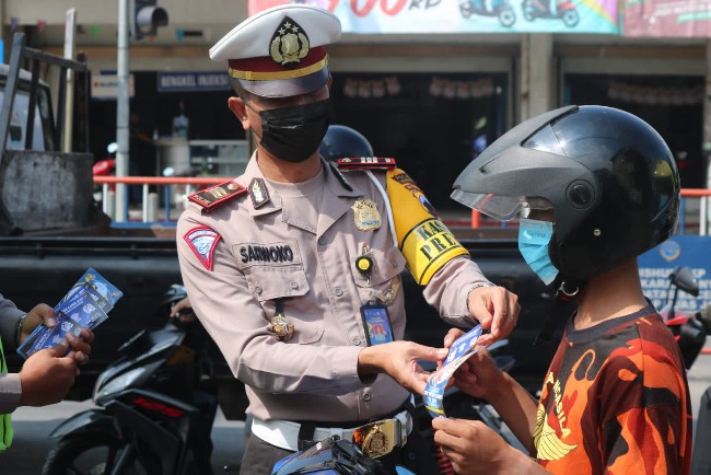 Kasatlantas menjelaskan, dilakukan pula pembagian stiker dan leaflet perihal keselamatan berkendara dan prokes serta masker. (humasreskra)