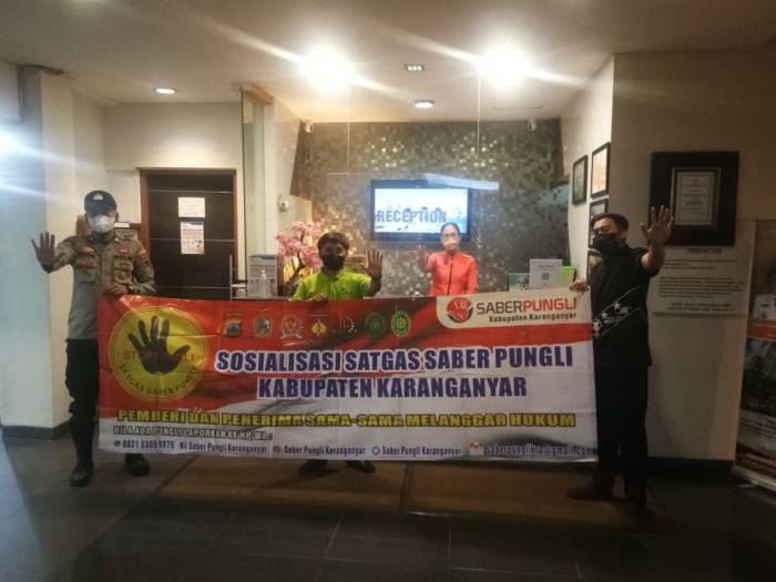 Polres Karanganyar – Aiptu Suparno bersama Bhabinkamtibmas Ds.Gondosuli Briptu Endro Prasetyo memberikan sosialisasi dengan materi saber pungli di Hotel Bintang Tawangmangu sesuai Dasar hukum pembentukan dan pelaksanaan tugas Saber Pungli Kab. Karanganyar. Rabu (20/10) malam.