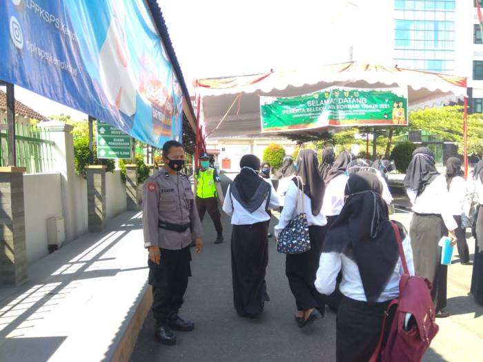 AIPTU JOKO SANTOSO mempimpin langsung pengamanan tes pagi ini dibantu oleh Aipda Fesdiana Catur, S.T, Brigadir Septian eko santoso, Briptu Andi wahyudi (Sat. Intelkam Polres Kra) terus memberi himbauan kepada peserta tes untuk mematuhi protokol kesehatan dan menjaga jarak guna mencegah penyebaran covid-19.