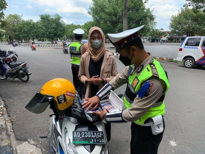 Polres Karanganyar – | Untuk memberikan sosialisasi dan edukasi kepada masyarakat tentang pelaksanaan Operasi Zebra Candi 2021, Polres Karanganyar Polda Jawa Tengah melakukan pembagian stiker, masker dan pamflet disiplin protokol kesehatan serta disiplin berlalu lintas, Selasa, (16/11/2021).