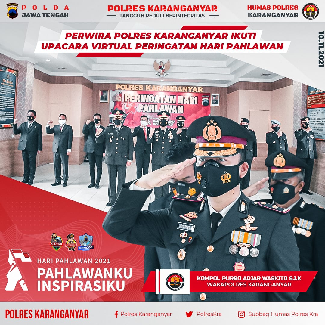 Upacara peringatan hari Pahlawan 10 November 2021 di peringati perwira Polres Karanganyar secara virtual, bertempat di aula Samapta Mapolres Karanganyar. Upacara secara virtual bertemakan Pahlawanku Inspsirasiku di Mapolres dipimpin Wakapolres Sragen Kompol Purbo Adjar Waskita, diikuti para pejabat utama. Rabu (10/11/2021)