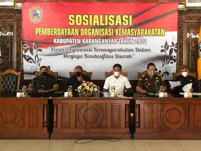 Sosialisasi tersebut diselenggarakan oleh Badan Kesatuan Bangsa dan Politik “Kesbangpol” Kabupaten Karanganyar dengan peserta dari perwakilan Organisasi Masyarakat di Kabupaten Karanganyar yang terdaftar di Kesbangpol, serta dihadiri dan sebagai narasumber Bupati Karanganyar Drs. H. Juliyatmono MM, Kasat Intel Polres Karanganyar, AKP Teguh Sujadi, S.Sos., MH, Kasdim 0727 Karanganyar, Mayor Inf Sudarmin , Kasi Intel Kejaksaan Negeri Kab. Karanganyar Gayus Kemal, SH dan Kepala Kesbangpol Kab. Karanganyar, Bambang Sutarmanto, S.Sos., M.M.