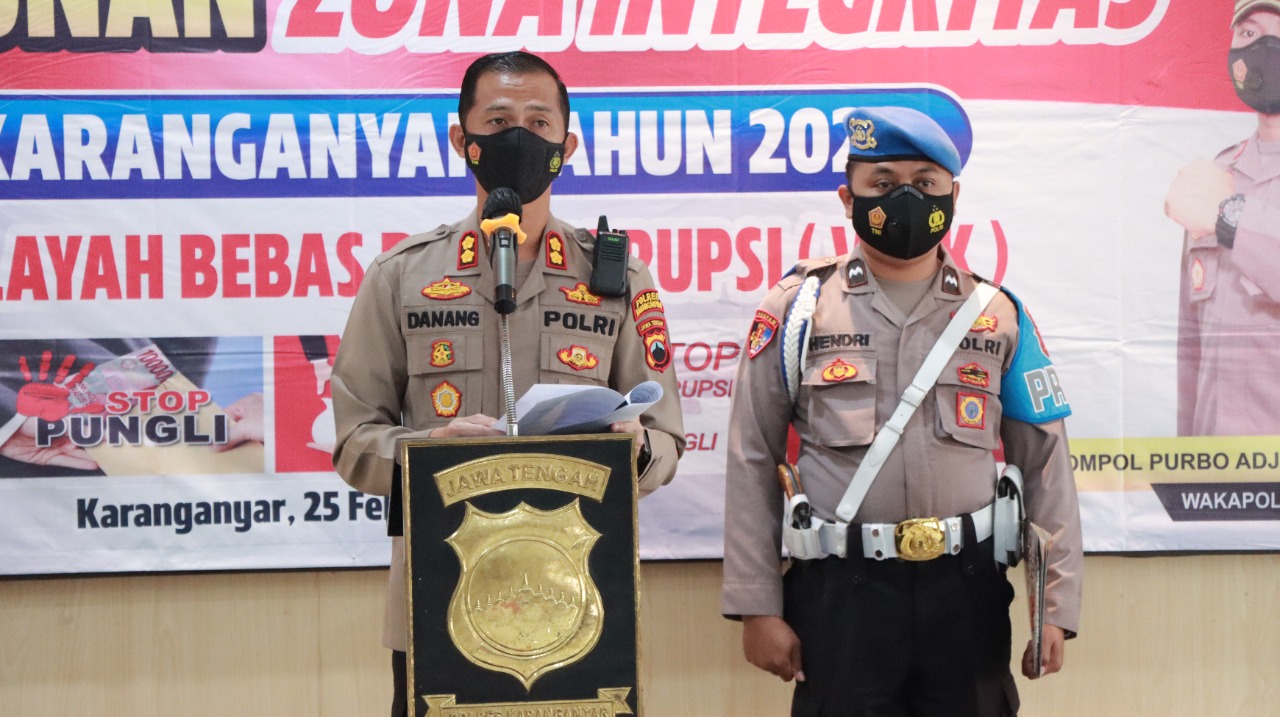 Disampaikan Oleh Kapolres Karanganyar AKBP Danang Kuswoyo, S.I.K, pencanangan pembangunan Zona Integritas (ZI) ini merupakan kegiatan awal dari kegiatan pembangunan Zona Integritas (ZI) Polres Karanganyar menuju Wilayah Bebas dari Korupsi (WBK).