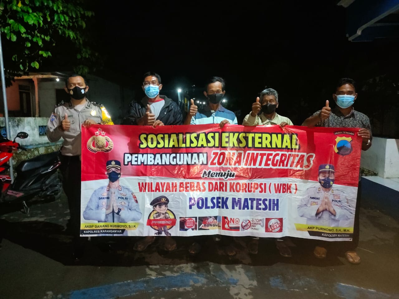 Personil Polsek  Matesih   mensosialisasikan Zona Integritas kepada Warga dusun Dawung Kecamatan Matesih yang saat itu sedang melakukan kegiatan Ronda malam di dusun tersebut.