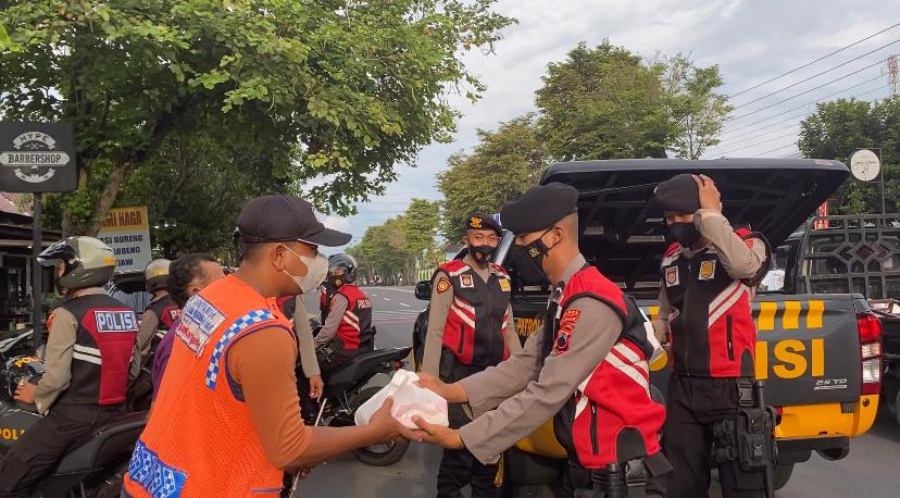 Saat membagikan takjil, personel patroli juga memberikan imbauan kepada para tukang parkir agar selalu waspada dalam mengawasi kendaraan yang diparkir.