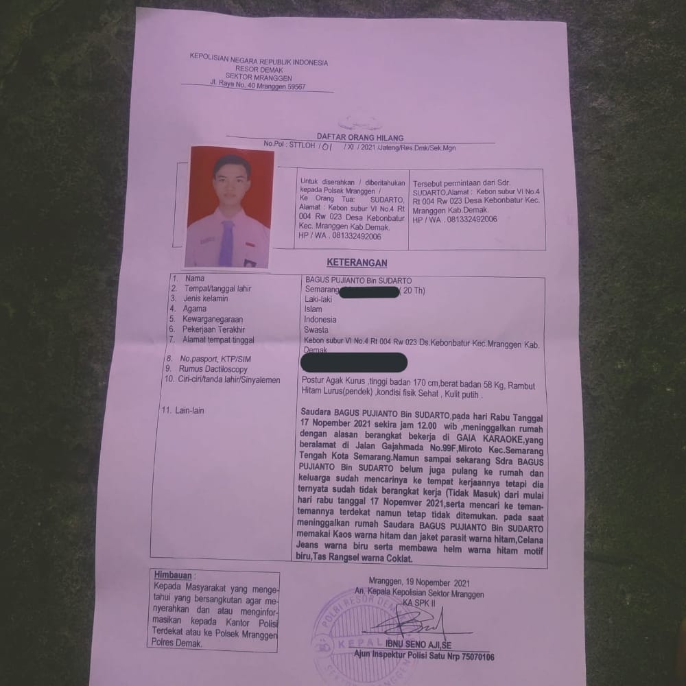 “Hilangnya pemuda tersebut itu sudah kami koordinasikan dengan jajaran. Kasus tersebut pernah dilaporkan ke polsek Mranggen Polres Demak dan langsung mendapat respon. Bukti petunjuk anak ini sudah dewasa , sudah bekerja di tempat hiburan dan menurut keluarga permintaan tebusan 2,5 ( Dua juta Lima Ratus rp ) Polri sudah melakukan pencarian kepada sosok Bagus Pujianto dan sudah diterbitkan pula daftar orang hilang atas nama tersebut,” kata Kabidhumas, Selasa (31/5/2022)
