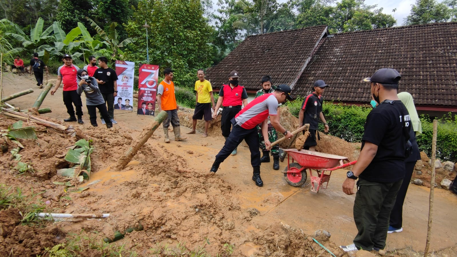 Guna meminimalisir resiko terjadinya bencana alam berupa tanah longsor, Polsek Kerjo bersinergi dengan Pemerintah Kecamatan, Ormas dan segenap elemen masyarakat Kerjo bahu membahu membersihkan material longsor yang terjadi beberapa saat lalu di area perkebunan PTPN diwilayah Kecamatan Kerjo.
