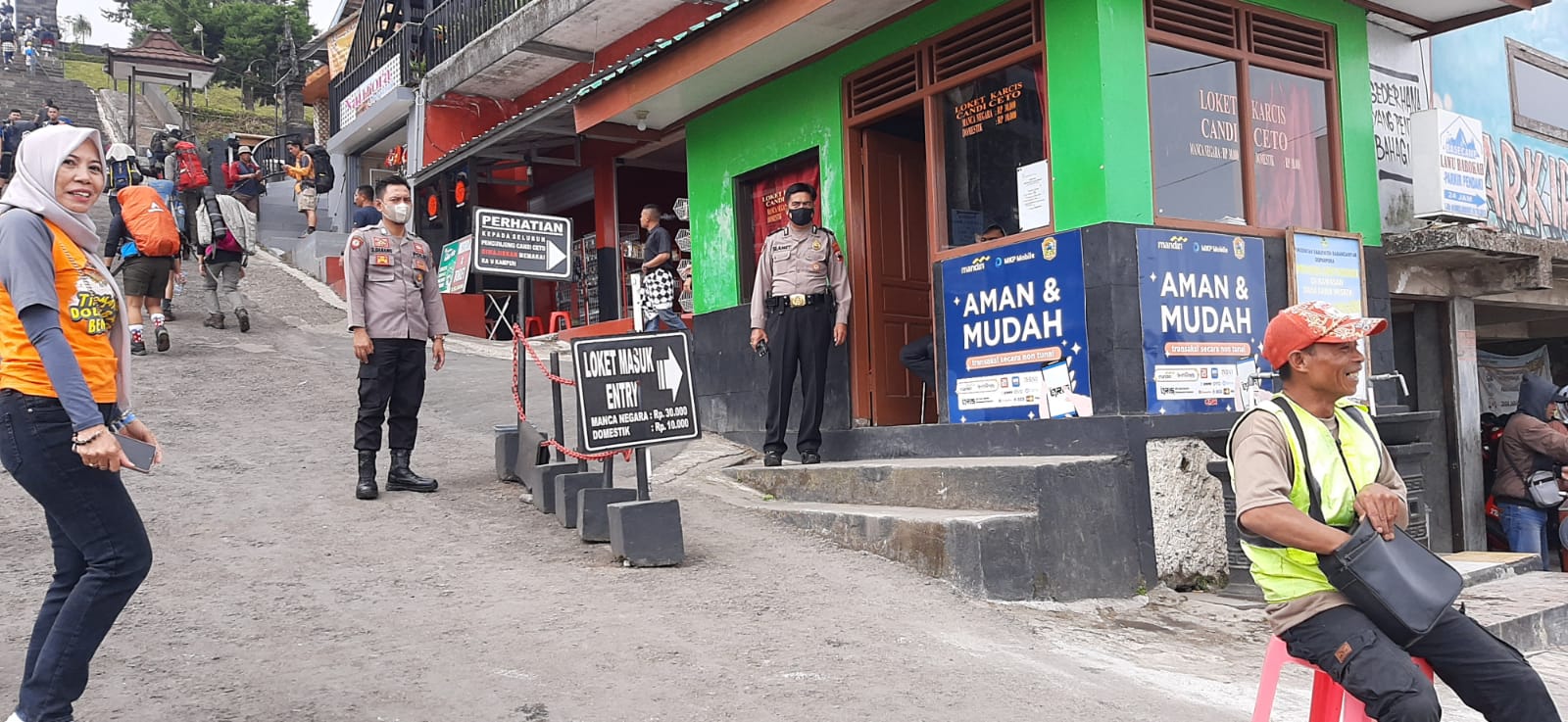 Polres Karanganyar – Tribratanews.jateng.polri.go.id| Tiga anggota Polsek Jenawi, Polres Karanganyar melaksanakan patroli dan pengamanan obyek wisata Candi Cetho. Kegiatan ini dipimpin langsung oleh Kapolsek Jenawi, AKP Sudirman. Sabtu (30/7) siang.