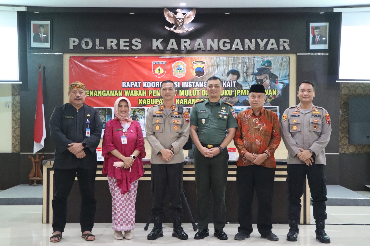 Untuk menjaga agar kondisi Kabupaten Karanganyar tetap aman dan kondusif serta meminimalkan resiko PMK, Polres Karanganyar menggelar Rapat Koordinasi Lintas Sektoral (Rakor Linsek) untuk membahas Penanganan Wabah Penyakit Mulut dan Kuku pada Hewan Di Kabupaten Karanganyar, Kamis (30/6) siang.