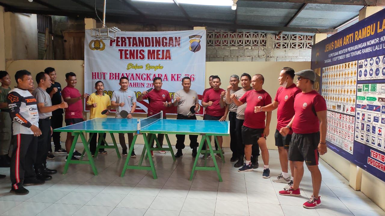 Polres Karanganyar – Tribratanews.jateng.polri.go.id| Sebagai wujud sinergitas dan dalam rangka Hari Bhayangkara ke 76, Forkopimca Matesih menggelar pertandingan tenis meja di Mapolsek Matesih, Rabu (6/7) pagi.