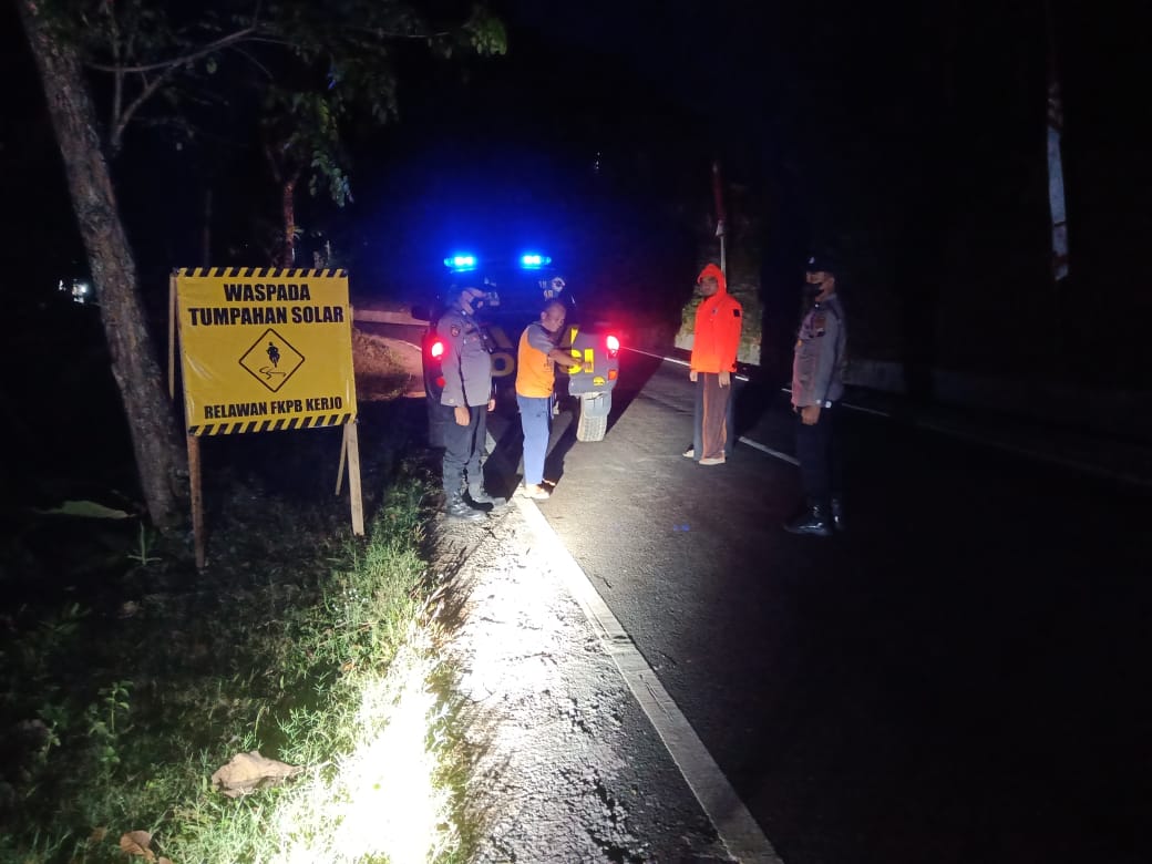 Polsek Kerjo bersama relawan Kerjo langsung menyisiri titik – titik tumpahan solar di sepanjang sepanjang jalan Kerjo – Jenawi maupun Kerjo – Mojogedang, Minggu ( 31/7) malam.