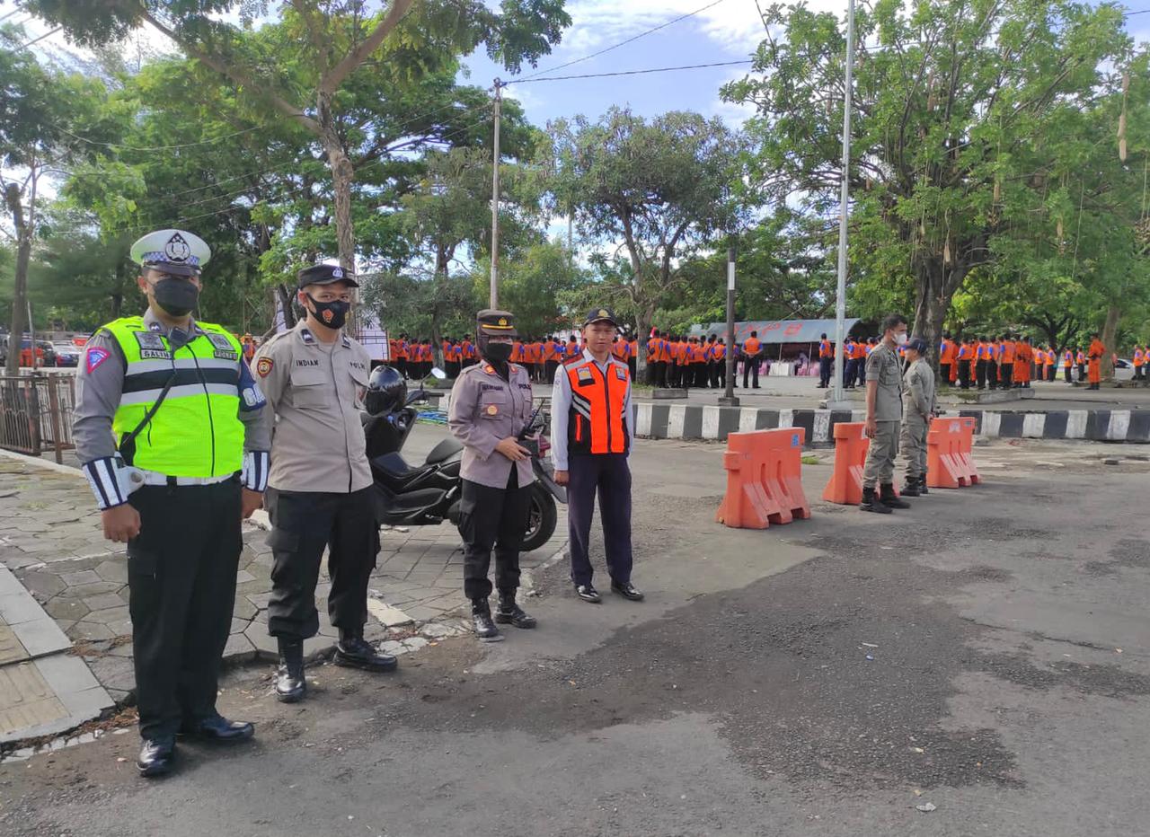 Polres Karanganyar – Jajaran anggota Polres Karanganyar mengamankan kegiatan apel siaga penanggulangan bencana di Plaza Alun – Alun Karanganyar. Rabu (26/10) pagi.
