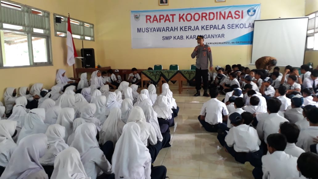Bertempat Aula SMPN 2 tersebut Wakapolsek Tawangmangu Iptu Mahmudi, S.H bersama anggota, memberikan pembinaan tentang UU No: 22 tahun 2009 tentang etika berlalu lintas dijalan raya.