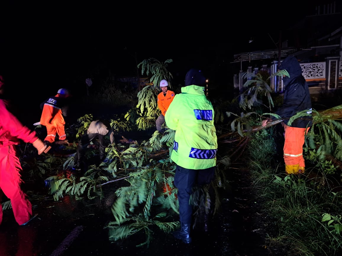 “ Evakuasi pohon tumbang yang diakibatkan hujan deras pada jumat malam tersebut, bersama Tim SAR, BPBD serta relawan proses evakusai tidak lama sekitar 30 menit dan akses jalan sudah bisa digunakan kembali” lanjutnya.