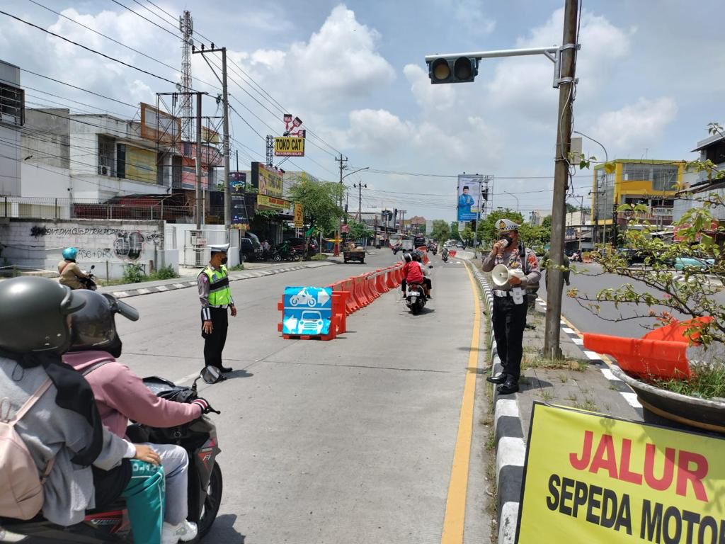 Nampak Kanit Kamsel Satlantas, Ipda Teguh Sarwono bersama 2 anggota berada di lokasi untuk mengurai kepadatan arus yang merayap dari jembatan Jurug sampai ke Fly Over Palur.