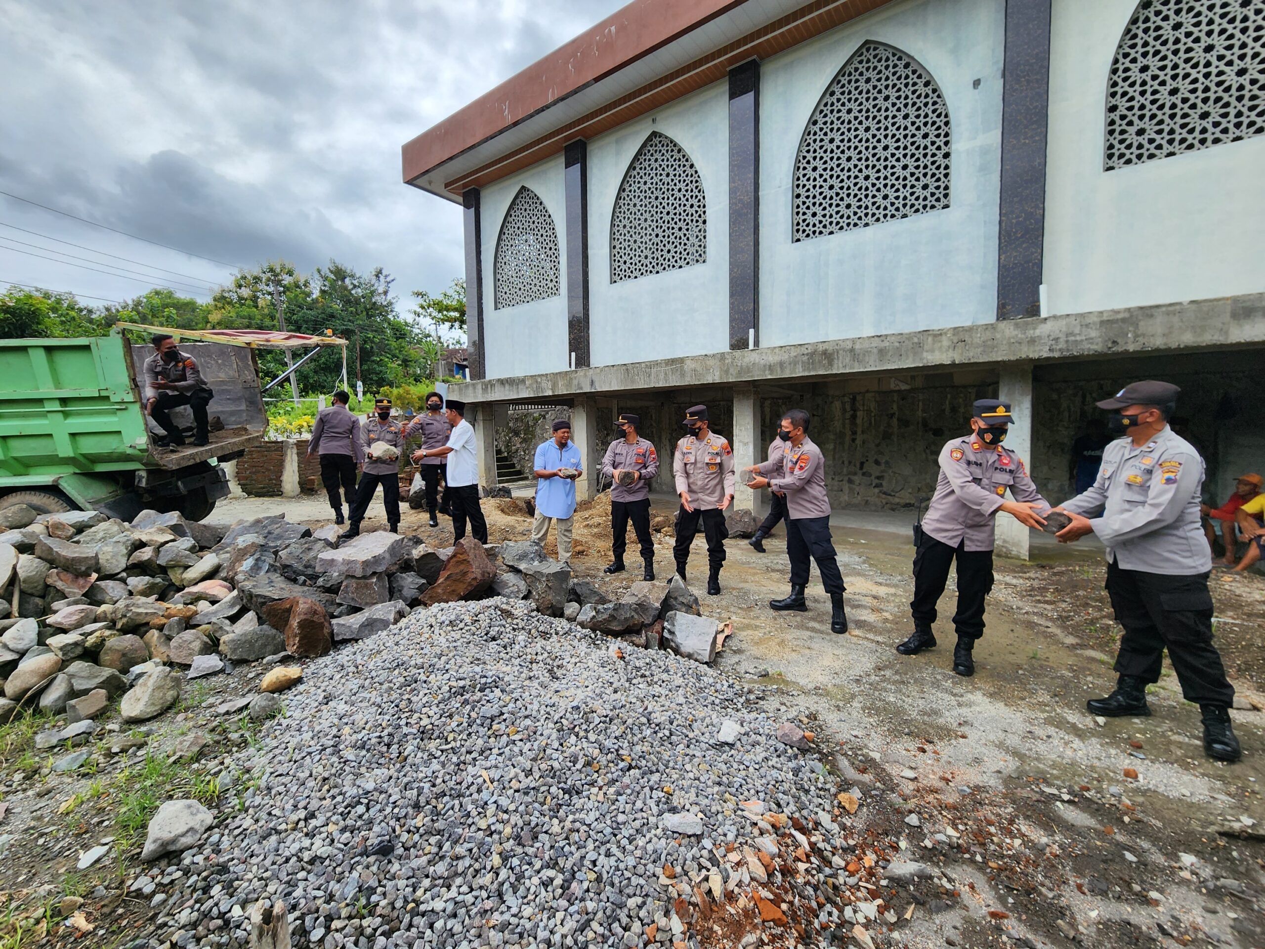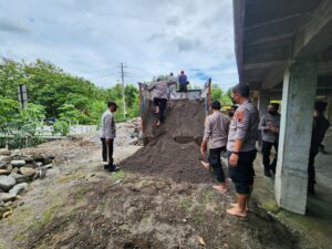 Puluhan anggota Polres dan Polsek juga nampak bergotong royong dengan warga untuk menurunkan pasir dan batu pondasi. Mereka nampak sangat senang melaksanakan kegiatan ini.