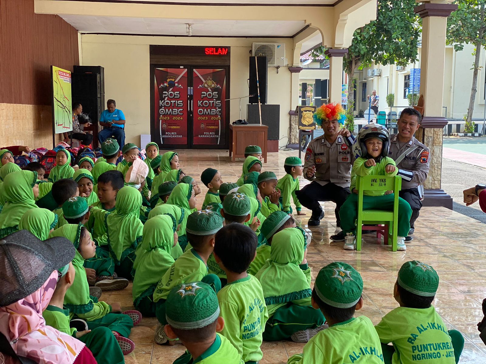Polres Karanganyar – Tribratanews.jateng.polri.go.id | Mapolres Karanganyar menerima tamu istimewa dari murid Taman Kanak-Kanak (TK) Al Ikhlas Ngringo Jaten dalam rangka kegiatan edukasi dan pengenalan tugas pokok Polri kepada murid TK tersebut, Selasa pagi (31/10).