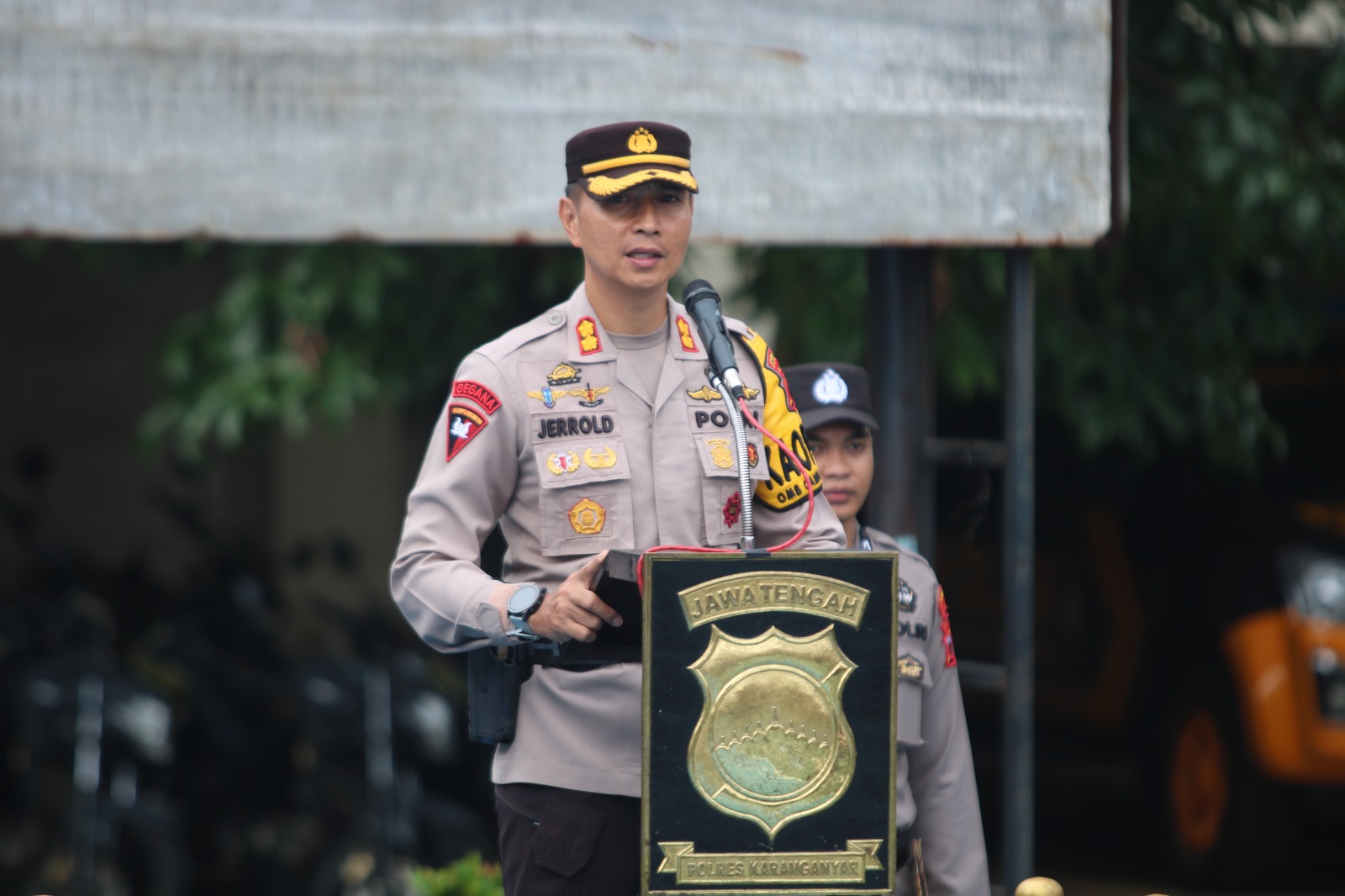Karanganyar – Kapolres Karanganyar AKBP Jerrold Hendra Yosef Kumontoy berikan arahan kepada anggota saat apel pagi jam pimpinan di lapangan Wirasatya Mapolres Karanganyar, Senin (29/1/24) pagi.