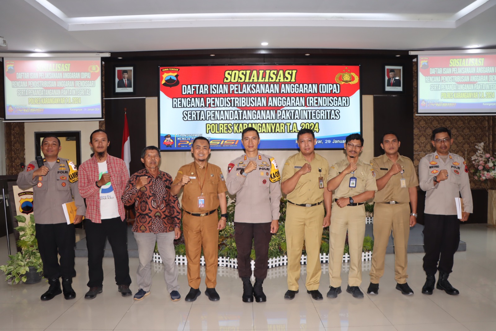 Karanganyar – Polres Karanganyar melakukan sosialisasi Daftar Isian Pelaksanaan Anggaran (DIPA) Rencana Pendistribusian Anggaran (Rendisgar) serta Penandatanganan Pakta Integritas Jajaran Polres Karanganyar Tahun2024 yang digelar di aula Wirapratama Polres Karanganyar bersama dengan jajaran dari pemerintah Kabupaten Karanganyar, Senin (29/1/24) siang.