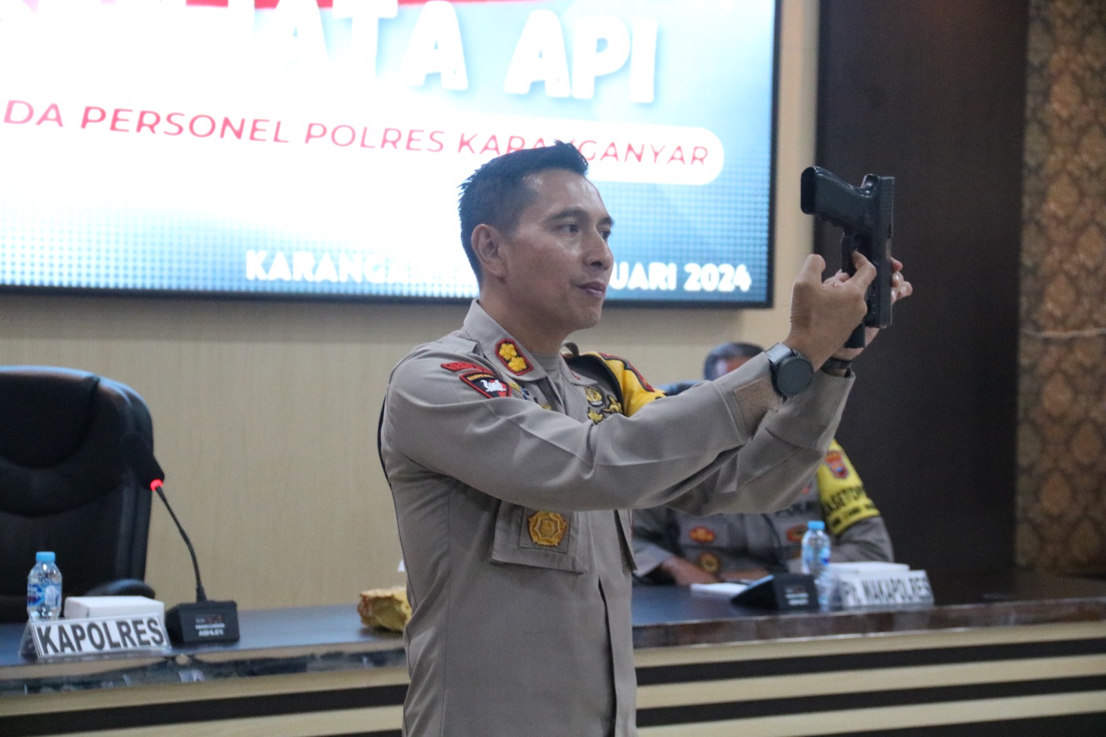 Polres Karanganyar- Meningkatkan keprofesionalan Anggota Polres Karanganyar kemampuan dalam hal perlakuan senjata api Polres Karanganyar menggelar latihan perlakuan mengunakan senjata api genggam dan Senjata api serbu di Aula Wira Pratama I , Kamis (2/1/2024).